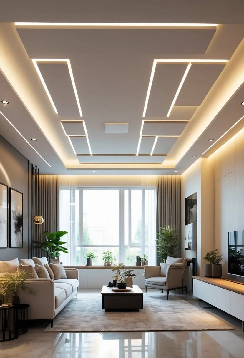 This design uses LED strips hidden within the false ceiling to provide soft, even lighting. It creates a modern and clean look while saving energy. The light can be adjusted to set different moods in the living room. It fits well with minimalist and futuristic ceiling styles.