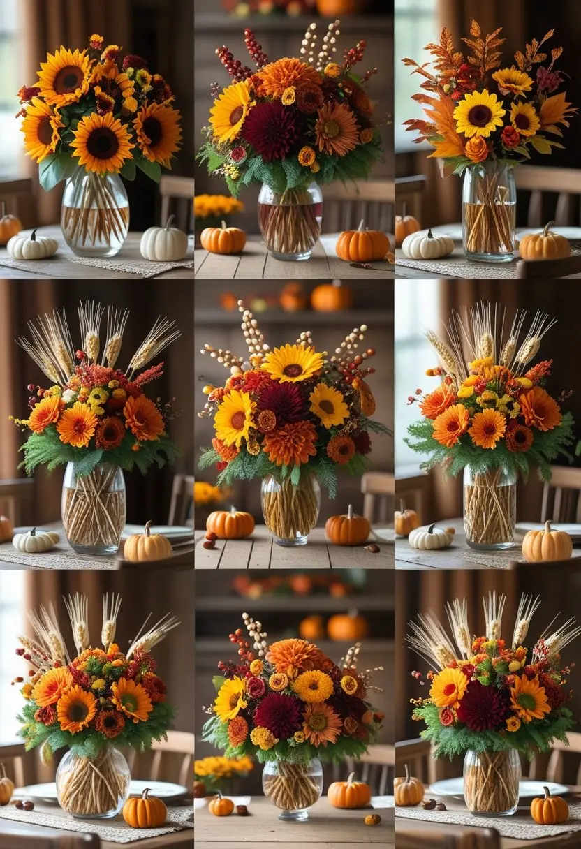 Flowers like sunflowers, mums, and dried wheat work well in this style. They bring warm tones that fit the fall season.